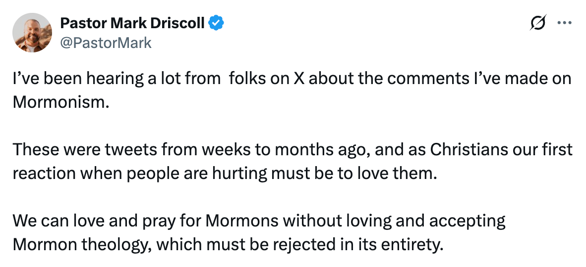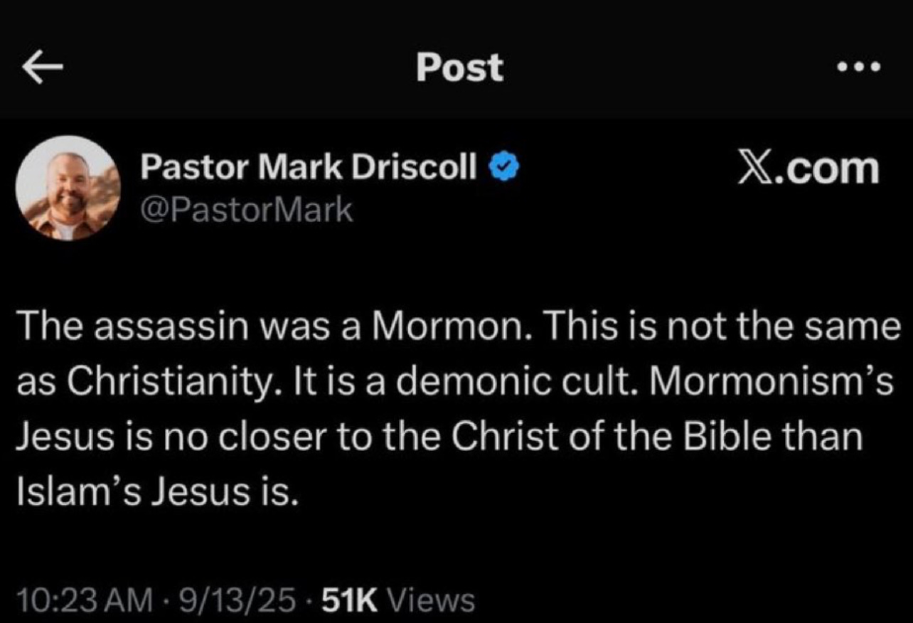 Less than a year later, when Charlie Kirk was assassinated, Driscoll declared online: “The assassin was a Mormon. This is not the same as Christianity. It is a demonic cult. Mormonism’s Jesus is no closer to the Christ of the Bible than Islam’s Jesus is.”