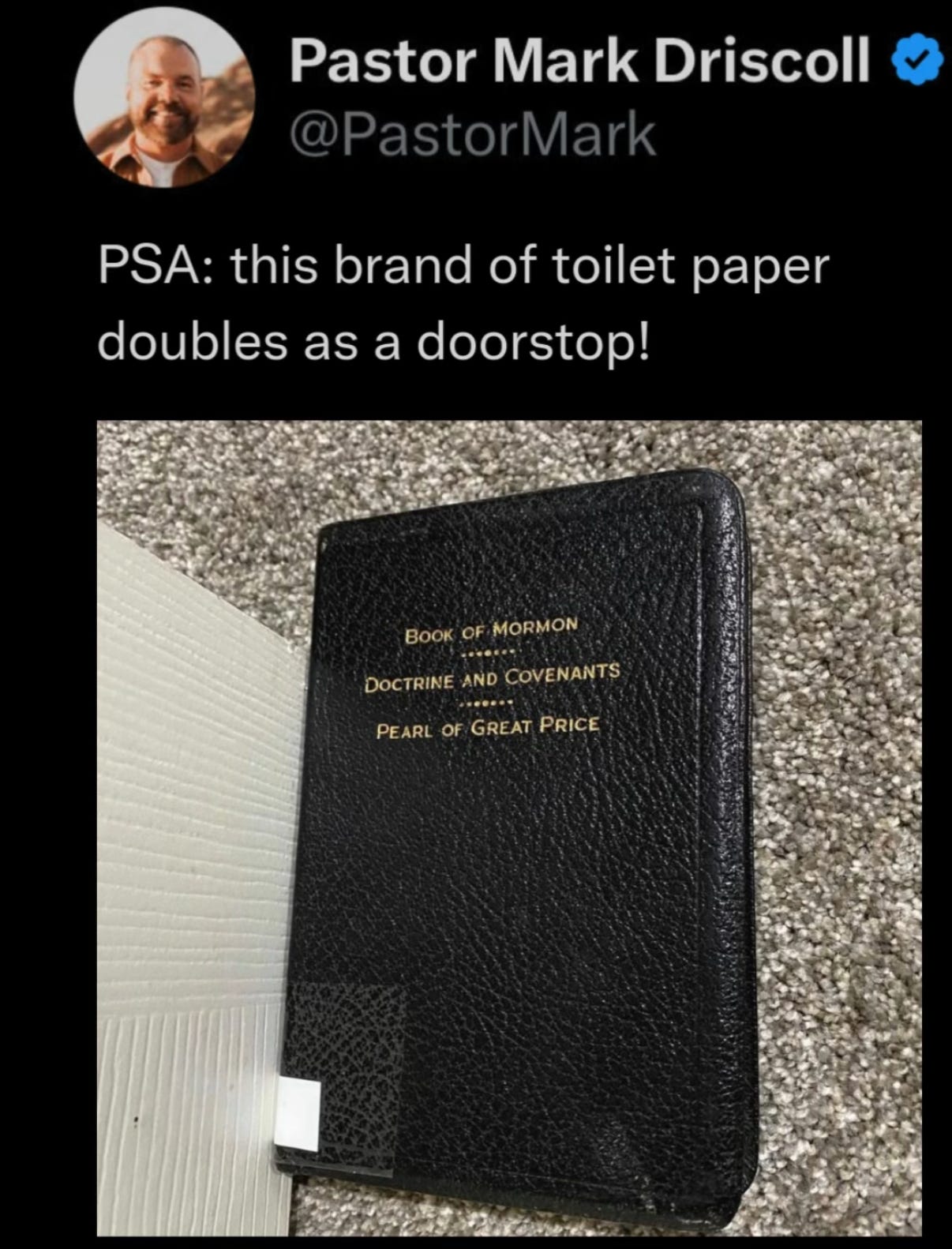 Anyway, fast-forward to September 2024, when he tweeted a photo of the Book of Mormon with the caption, “PSA: this brand of toilet paper doubles as a doorstop.” He later deleted it, but the same clip lingered on his YouTube channel for some reason.