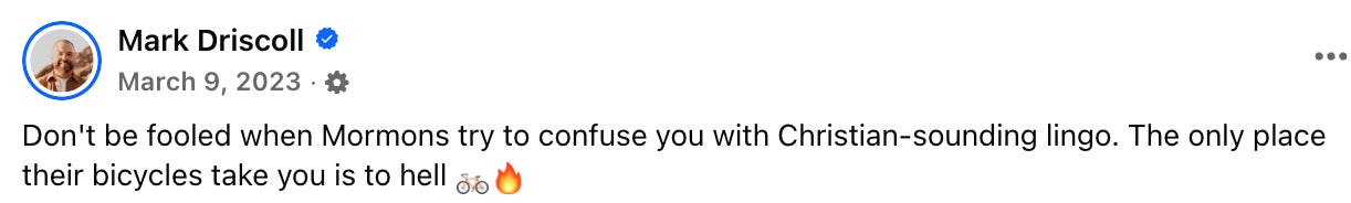 Anyhow, the very next day, Driscoll escalated: “There will be zero Mormons in Heaven. It is a demonic cult. A literal demon is on the top of every Mormon building.”